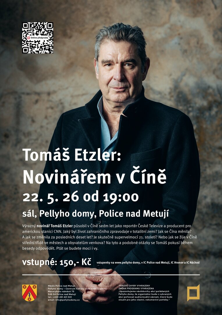 Pellyho domy v Polici nad Metují vás zvou na unikátní besedu s výrazným novinářem a reportérem Tomášem Etzlerem, která se koná v pátek 22. května 2026 v 19:00. První český novinář oceněný cenou Emmy vám přiblíží sedm let svého působení v Číně pro CNN a Českou televizi. Jak se žije v totalitní supervelmoci 21. století a jak se Čína za poslední dekádu změnila? Přijďte si poslechnout fascinující zážitky a položit své dotazy.