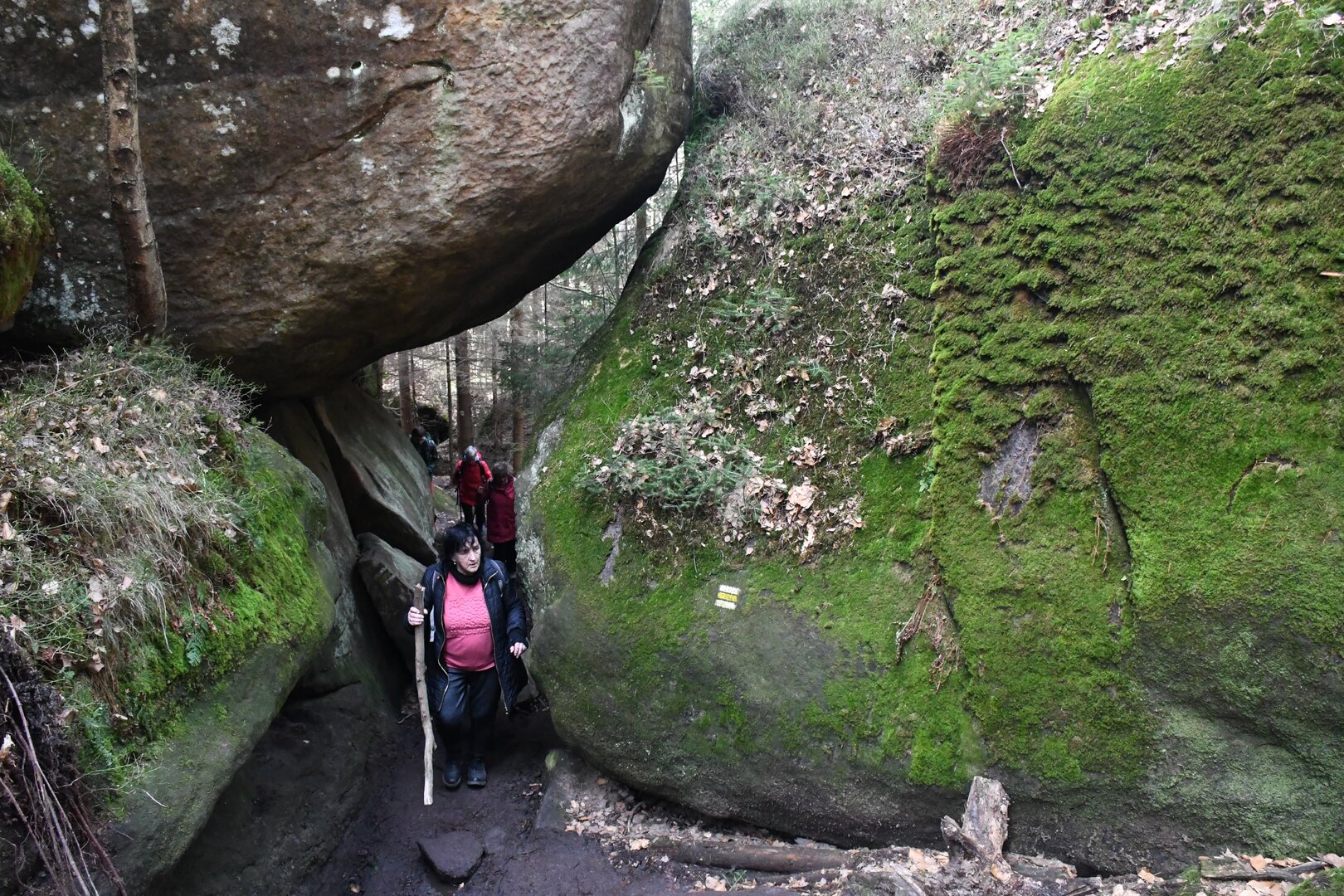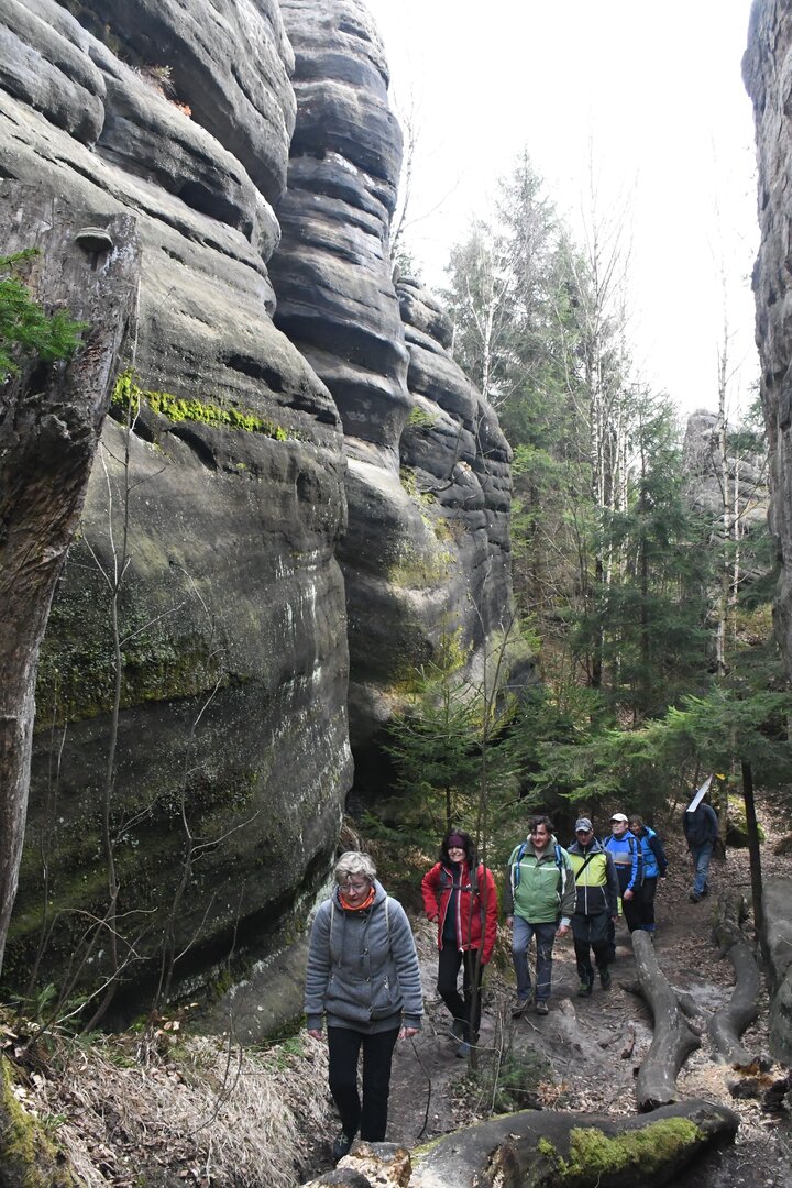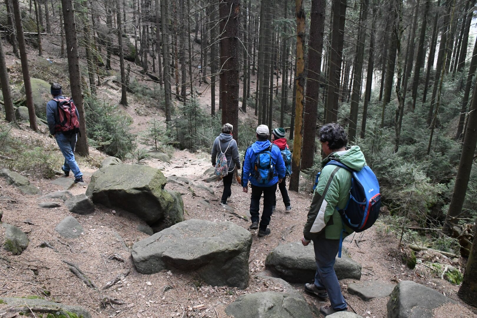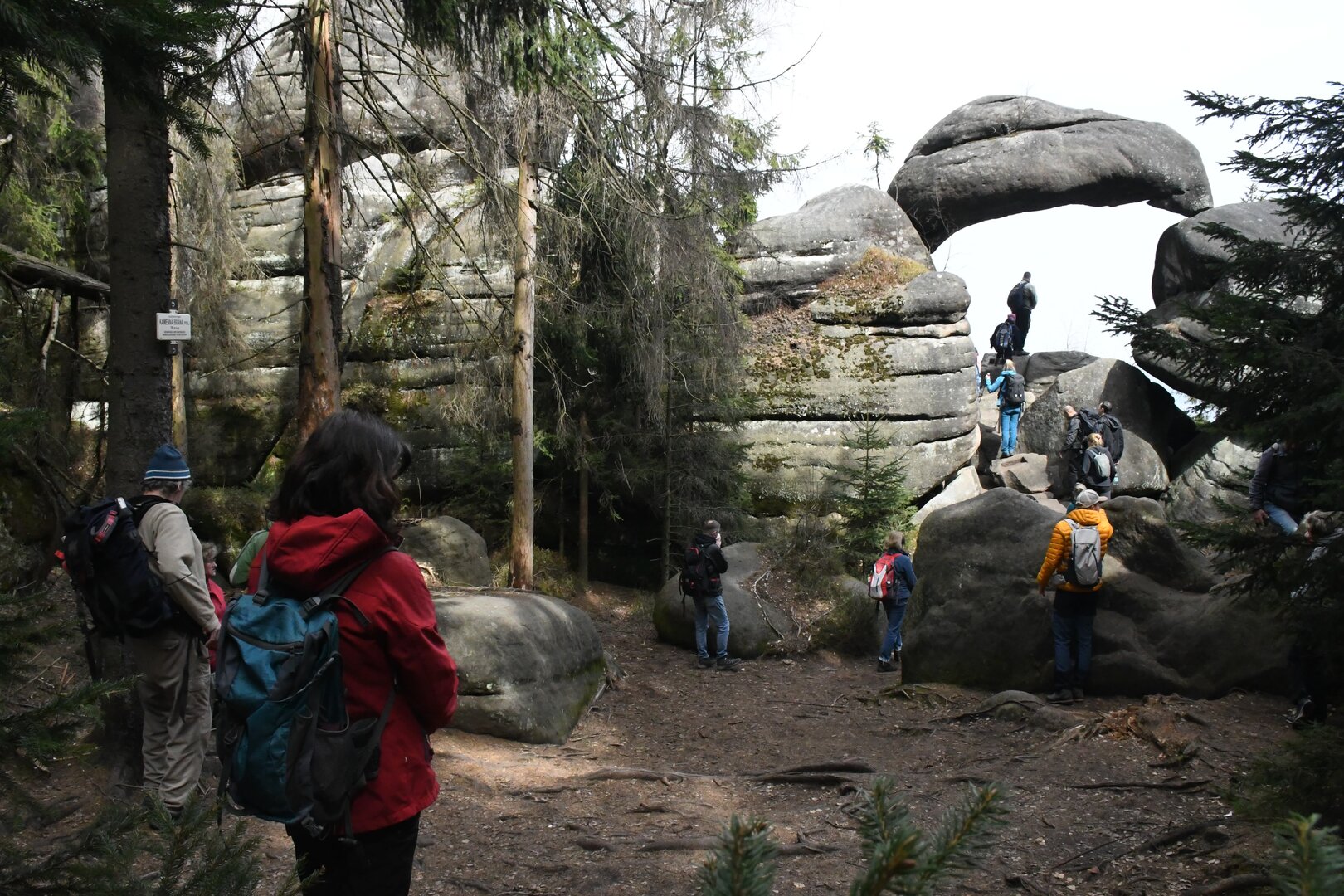 Ze Slavného jsme sestoupili Zaječí roklí na Dobytčí stezku a úbočím přes Třešňovou rokli došli k prameni pod Velkou kupou. Po obědové přestávce s pramenitou vodou jsme se zastávkami u Kamenné brány a vyhlídce na Broumovskou kotlinu pokračovali na vyhlídku na Koruně s úžasnými výhledy z ptačí perspektivy. Prošli jsme skalní zoologickou zahradu s množstvím kamenných přírodních plastik nejrůznějších zvířátek a hřibovitých výtvorů na Božanovském Špičáku.