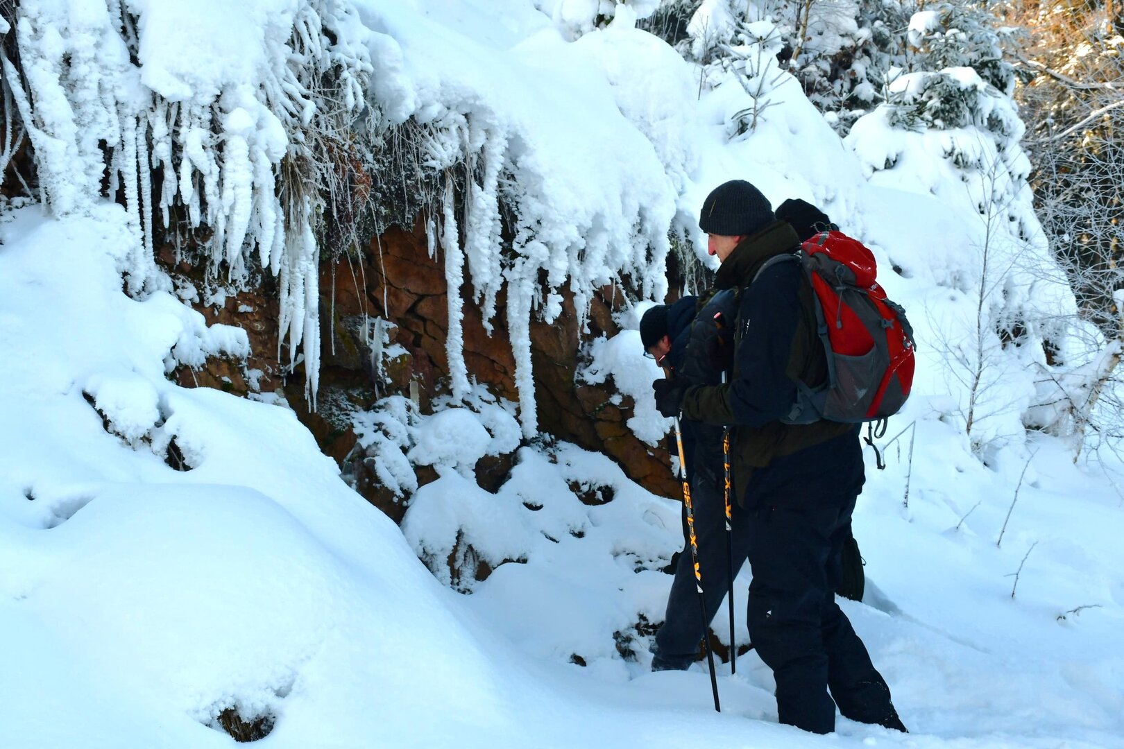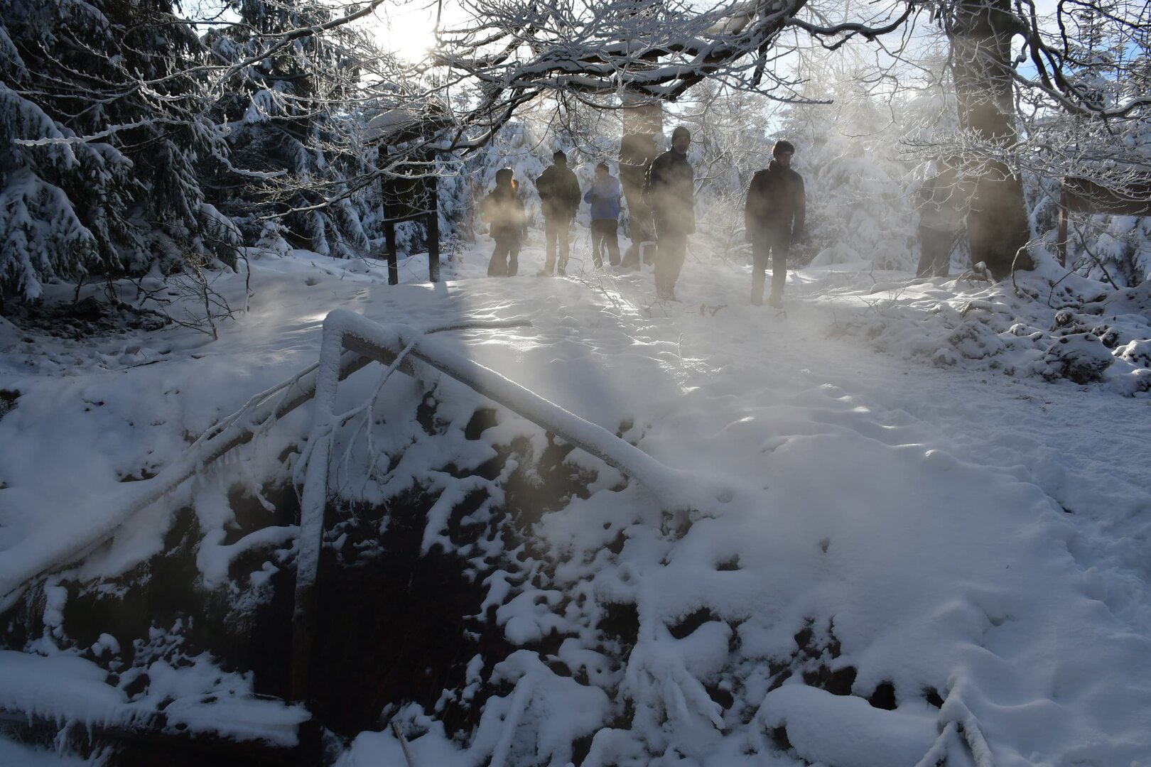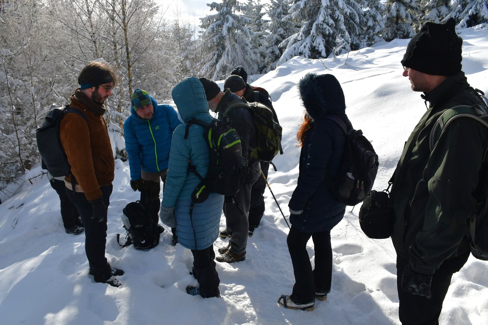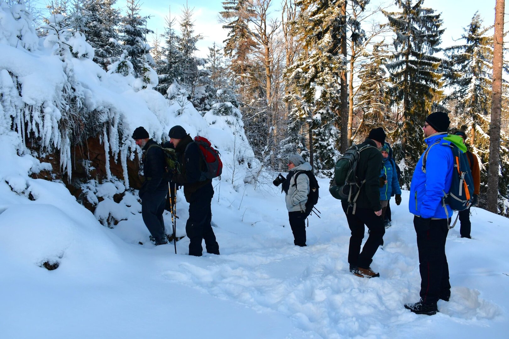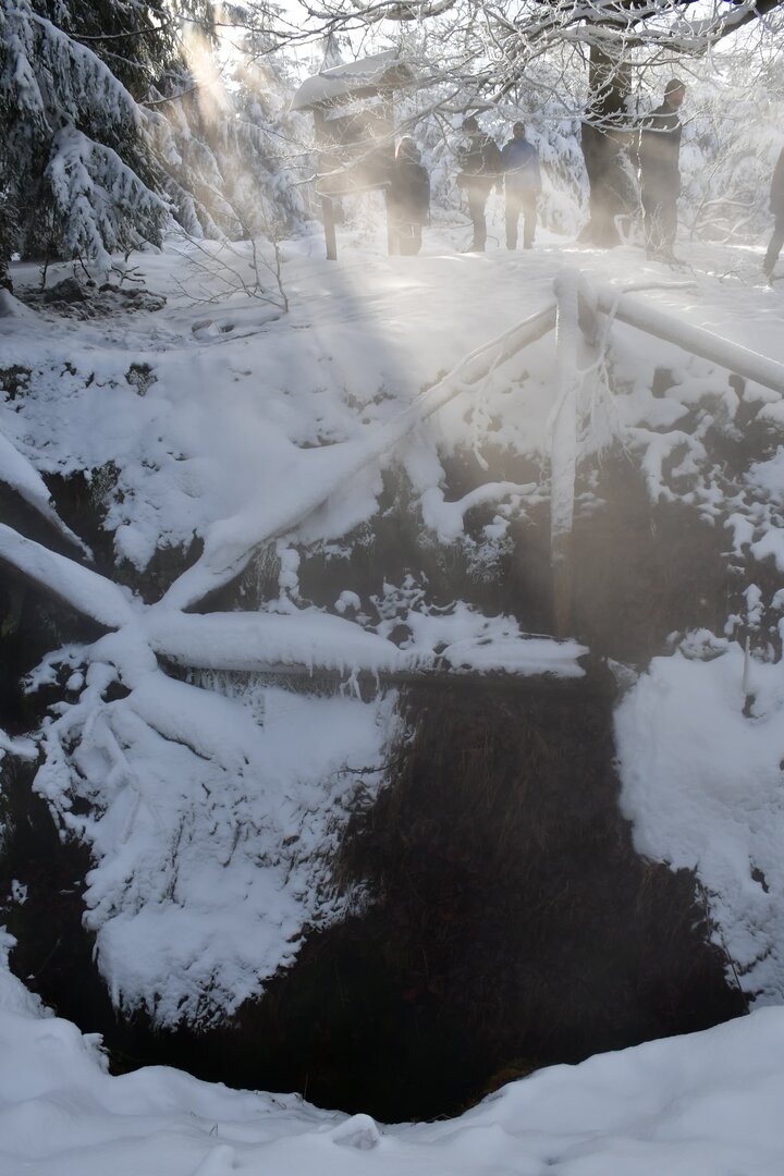 Mínus 10 stupňů, polojasno, lehká sněhová pokrývka - nic lepšího jsme si snad nemohli přát. :) Z parkoviště v opuštěném lomu u silnice v Unislawi jsme vyrazili po trase naučné EKO-stezky krásnou zimní přírodou. Kolem pramene Zbyszko jsme po lesní cestě k "žebříčku" pod Malou Lesistou a pak už s nasazenými nesmeky jsme se vyškrábali náročnějším zimním svahem k prvním teplo dýchajícím ventarolám (vysvětlení viz Pseudosopka u Šonova). Na plochém hřebenu jsme cestou obdivovali veliké množství ve sněhu vytátých travnatých fleků, které značí výstupy teplého vzduchu z hlubin hory. Po obědové pauze na vysluněném vrcholu Lesista Wielka jsme se vydali k velké ventarole, která nádherně pářila. Po cestě zpět do Unislawi jsme u rozcestí Szlak Dzika důkladně prozkoumali ještě několik pěkně "fungujících" ventarol i s pěkně narůstajícími ledovými krápníky.